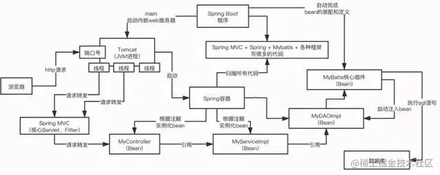 spring框架,mybatis,spring mvc,去做一些开发,打包部署到线上的tomcat里去,tomcat启动了,他就会接收http请求,转发给spring mvc框架,调用controller -› service -› dao -› mybatis(sql语句)