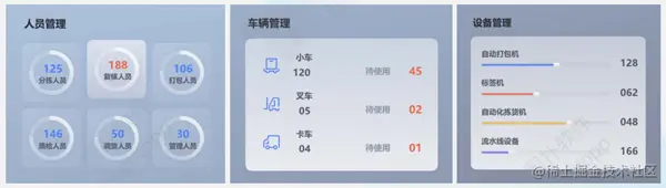 通过可视化等技术将仓储中心的设备、人员等信息都集成监控,实现运维管理统一化,智能化。仓储管理人员可以实时通过平台数据了解人员配置、车辆使用情况、设备数量监控。