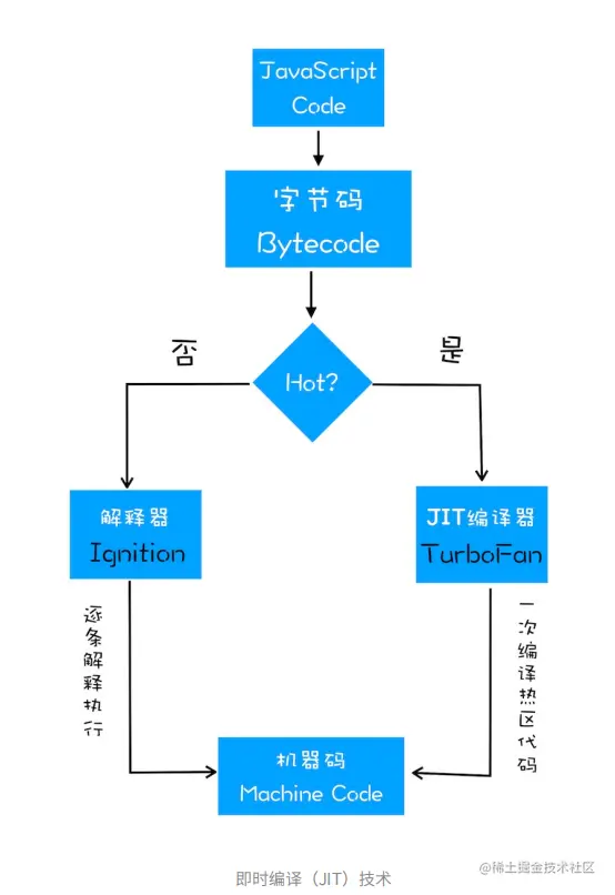 生成字节码之后,V8进入执行代码阶段,解释器(lgnition)会逐行解释执行。在执行字节码的过程中,如果一段代码被重复多次执行,解释器就会标记这段代码为热点代码,而后台的编译器(TurboFan)就会将这段热点字节码编译为高效的机器码,等后面在执行这段被优化的代码时,直接执行编译后的机器码就可以了,大大提高了代码的执行效率。这种字节码配合解释器和编译器的技术称为即时编译(JIT),V8引擎解释器(lgnition)会在执行字节码的同时会收集代码信息,当它发现一段代码执行多次之后,会通知编译器(TurboFan)将这段热点代码转换为机器码,并保存起来,用于下次使用。