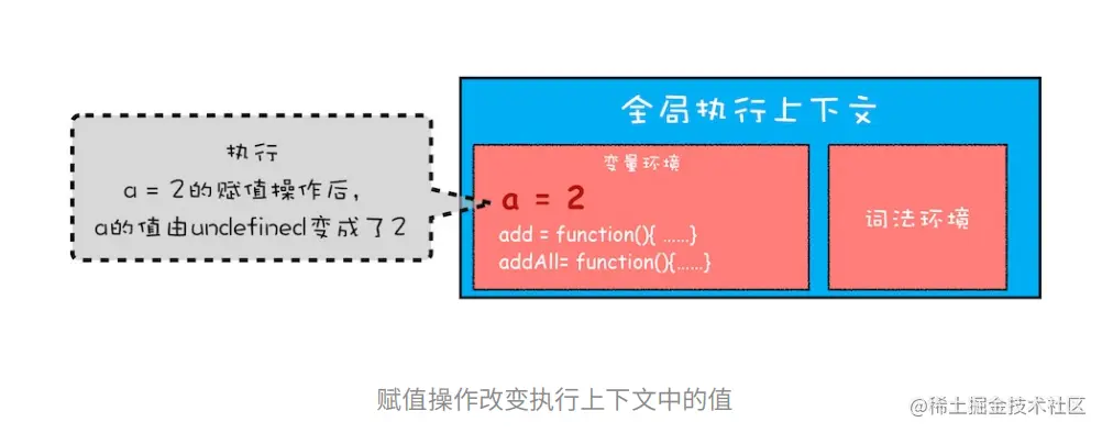 这个时候变量a,函数add,addAll都被保存在全局上下文的变量环境中。压入栈后V8引擎开始执行全局代码,首先执行a = 2赋值操作如下图: