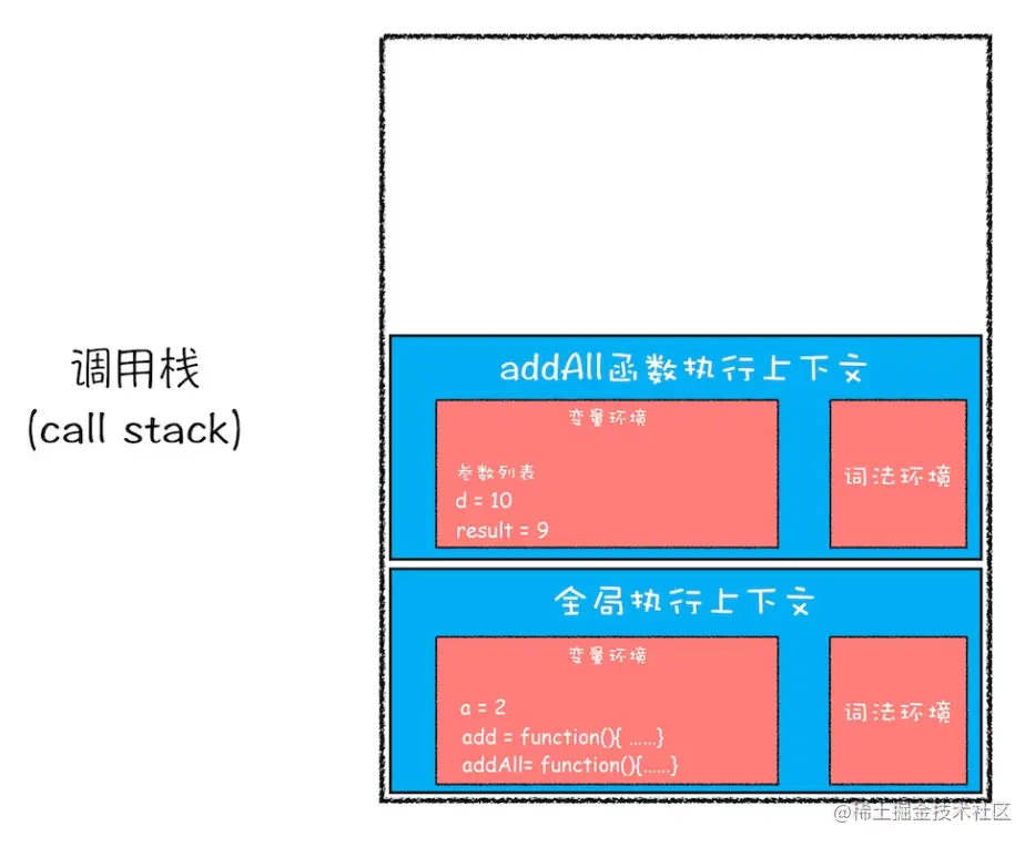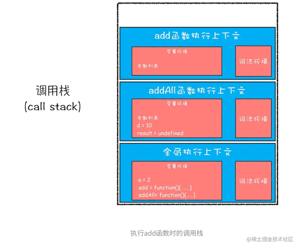 addAll函数创建执行上下文之后,执行函数代码,先执行b = 10,然后执行到add函数调用时,通过创建它的执行上下文压入到调用栈中.