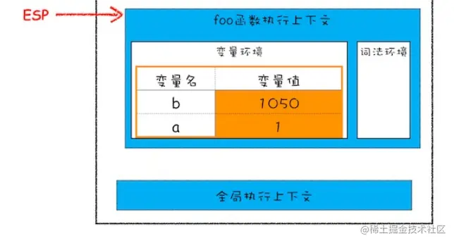 当执行到foo函数时,V8引擎会创建它的执行上下文并将其压入执行栈中,而这个时候还有一个记录当前执行状态的指针(ESP),这个指针会指向调用栈中的foo的执行上下文,表示当前正在执行foo函数。