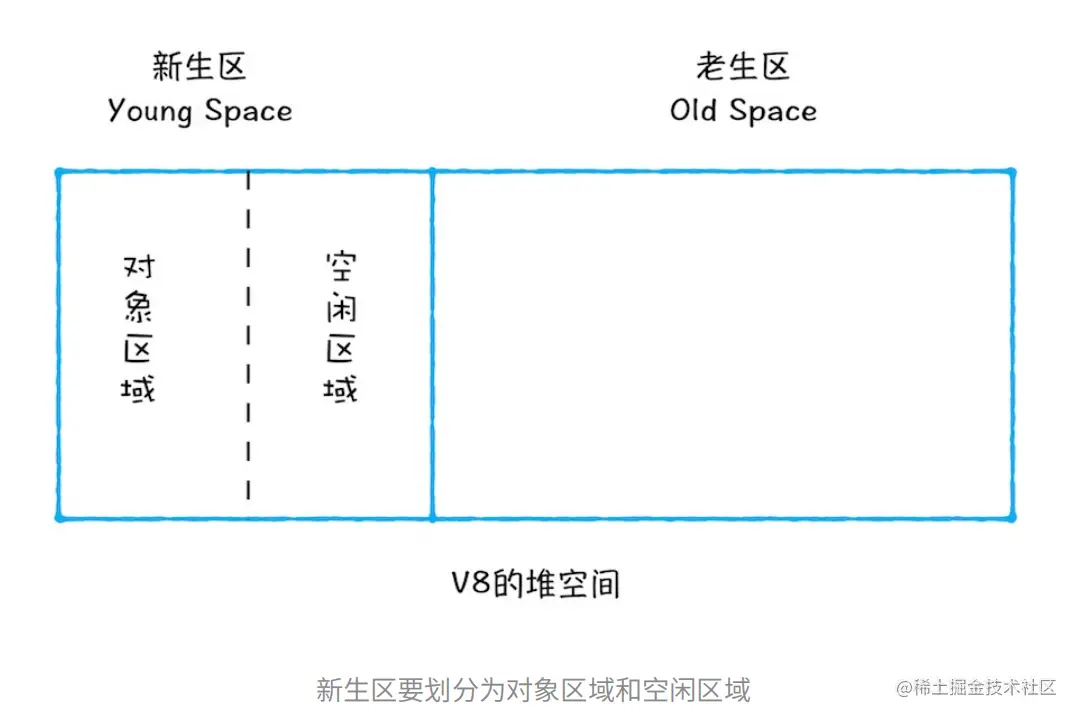 说完栈中数据回收我们再说下堆内存的数据回收,V8会将堆内存分为两块区域分别新生代和老生代: