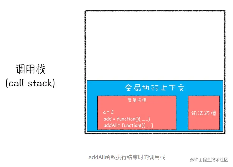 addAll执行完毕后返回最后的值,它的执行上下文也从栈顶弹出,最后调用栈中就只有全局执行上下文,这段代码就执行完毕了。