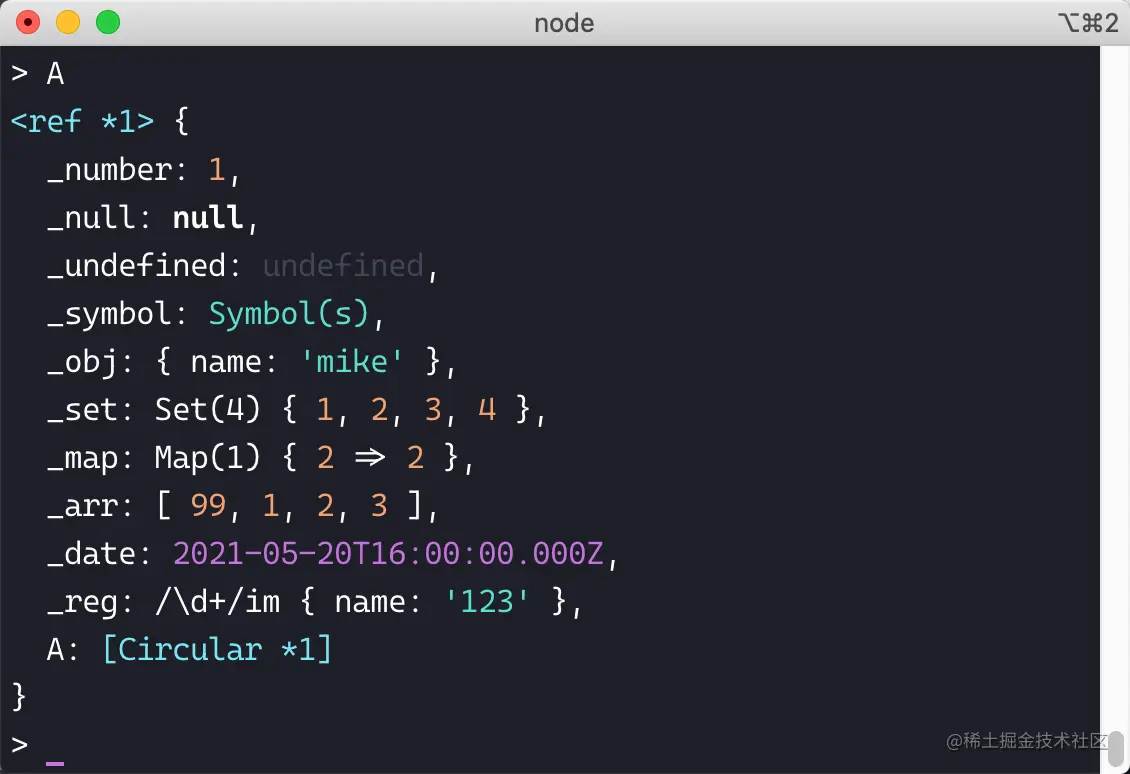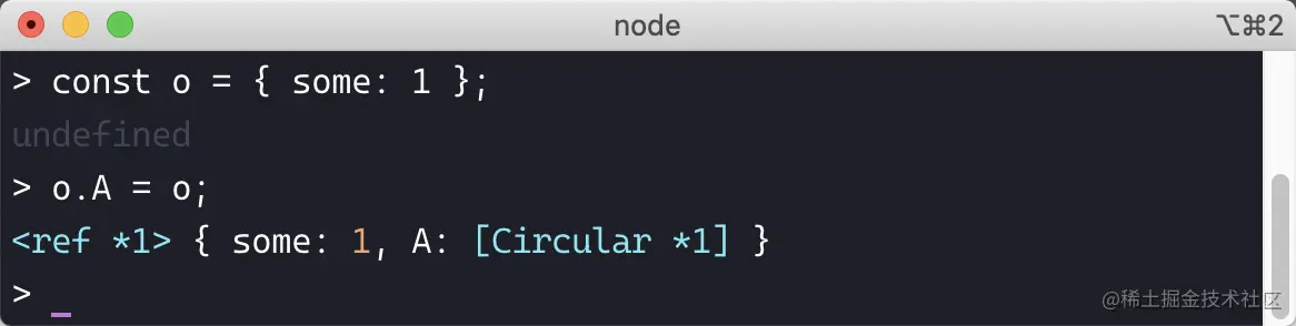 在 NodeJS 中,循环引用的对象用 [Circular] 表示:
