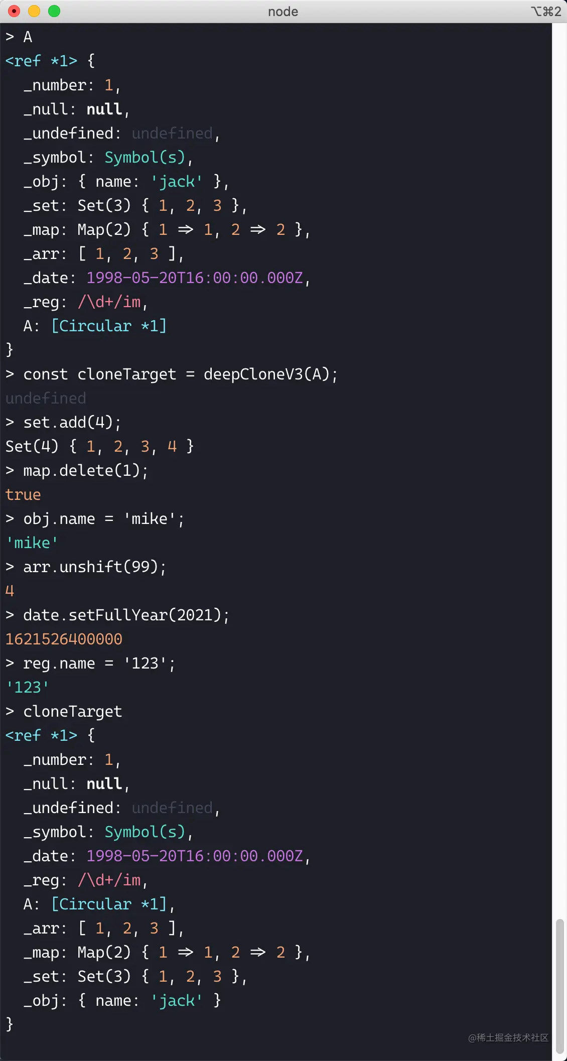 用 V2 测试一下含有循环引用的对象,看来正确拷贝了 [Circular].