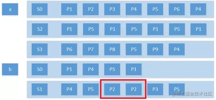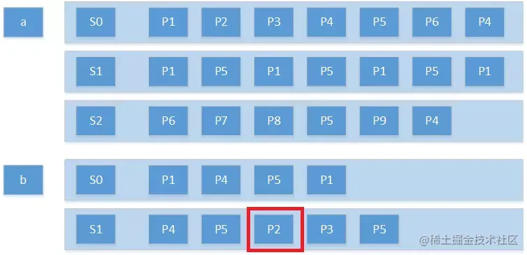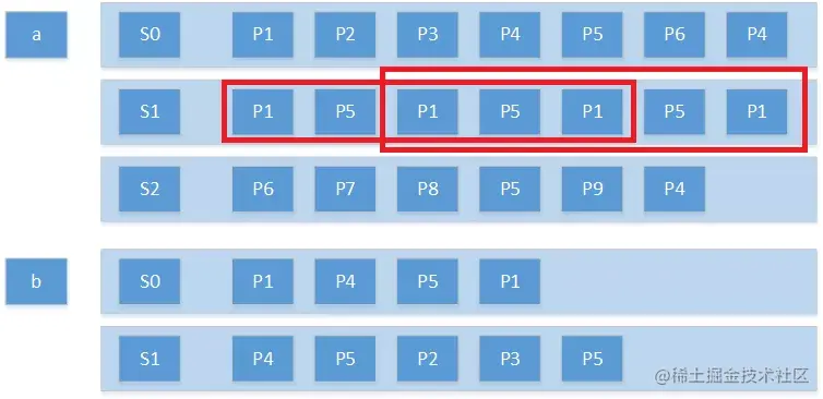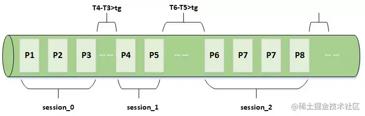 假设有用户a和用户b,a用户当天发生的行为事件分别为 E1, E2, E3... , 对应的页面分别为P1, P2, P3... ,事件发生的时间分别为T1, T2, T3... ,选定的session间隔为tg。如图所示T4-T3>tg,所以P1,P2,P3被划分到了第一个Session,P4,P5被划分到了第二个Session,同理P6及后面的页面也被划分到了新的Session。