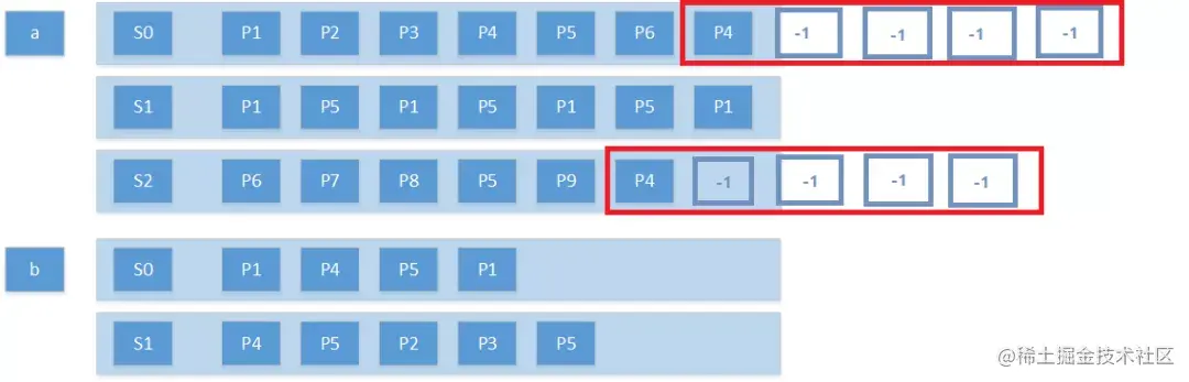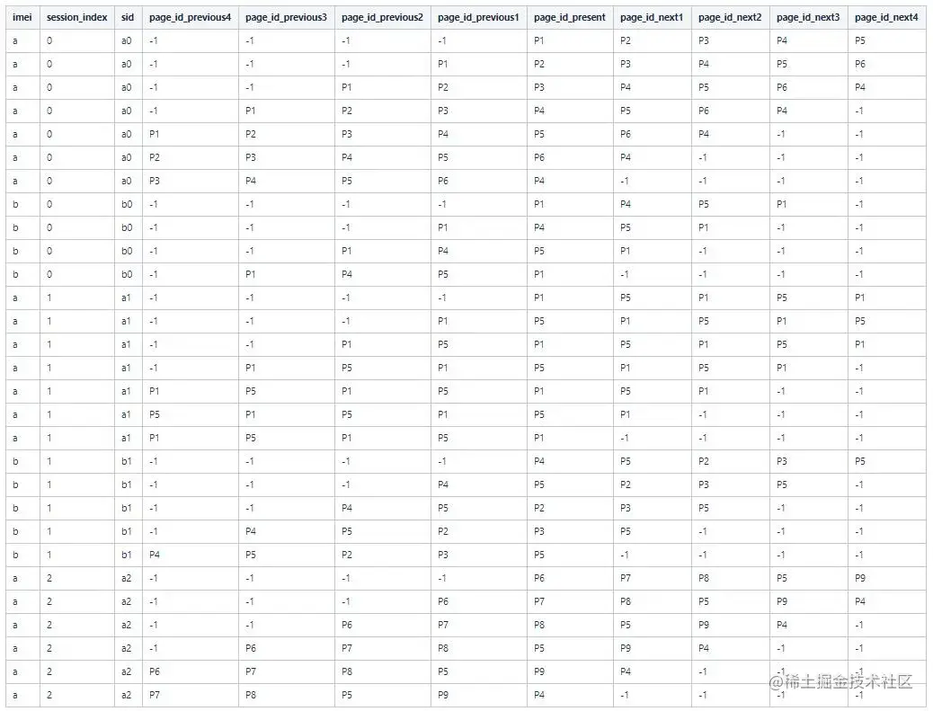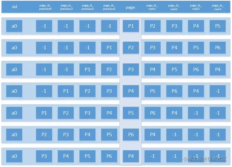然后对上述数据进行窗口函数分析,获取每个session中每个页面的前后四级页面,其中sid是根据用户标识ID和session号拼接而成,比如,针对上述的用户a的第一个session 0会生成如下的7条记录,图中的page列为当前页面,空页面用-1表示