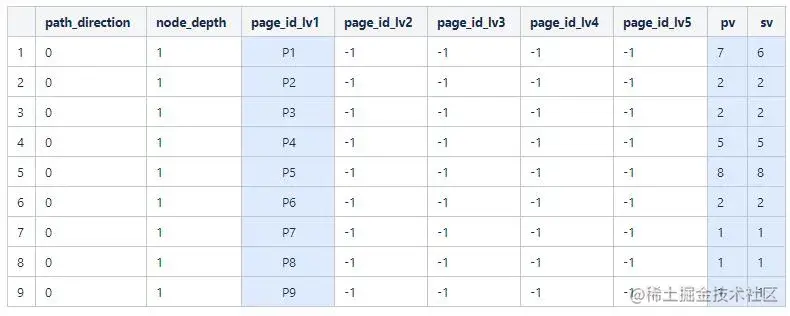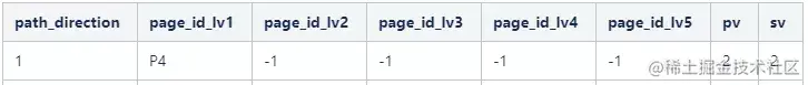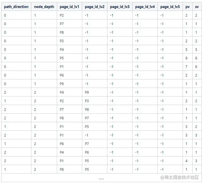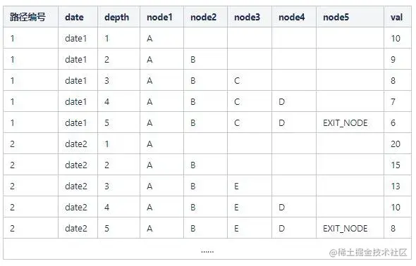 上述为路径表中比较重要的几个字段,分别表示节点深度和各级节点。表中的数据包含了完整路径和中间路径。完整路径指的是:路径从起点到退出、从起点到达指定终点,超出5层的路径当作5层路径来处理。中间路径是指数据计算过程中产生的中间数据,并不能作为一条完整的路径。