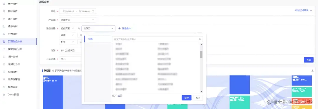 在场景对应到具体的技术方案设计上,我们将访问数据根据session划分,挖掘出用户频繁访问的路径;功能上允许用户即时查看所选节点相关路径,支持用户自定义设置路径的起点或终点,并支持按照业务新增用户/活跃用户查看不同目标人群在同一条行为路径上的转化结果分析,满足精细化分析的需求。