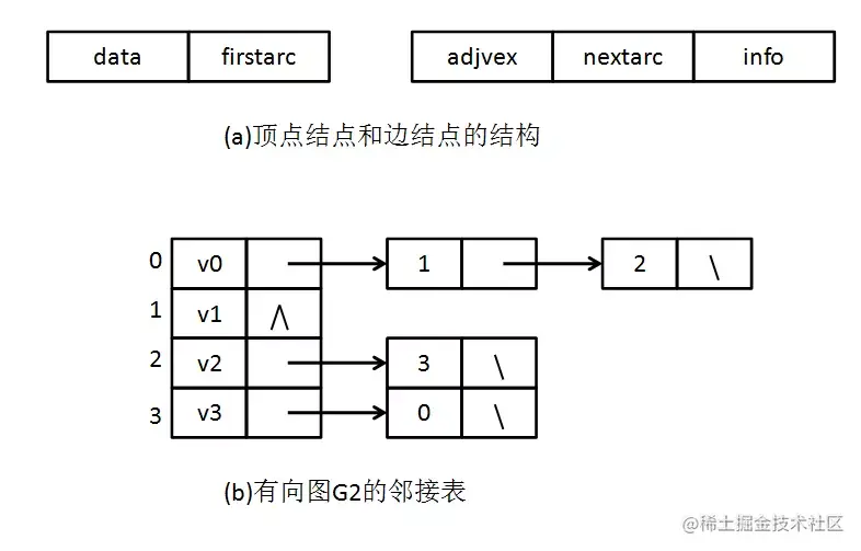 (a)中,左侧为顶点节点,包含顶点数据及指向第一条边的指针;右侧为边节点,包含该边的权重、出入度等边信息以及指向下一条边的指针。一个完整的邻接表类似于Hashmap的结构,如图(b),左侧是一个顺序表,保存的是(a)中的边节点;每个边节点对应一个链表存储与该节点相连接的边。页面路径模型中,为了适应模型的需要,我们对顶点节点和边节点结构做了改造,详情请见【4.1】节。