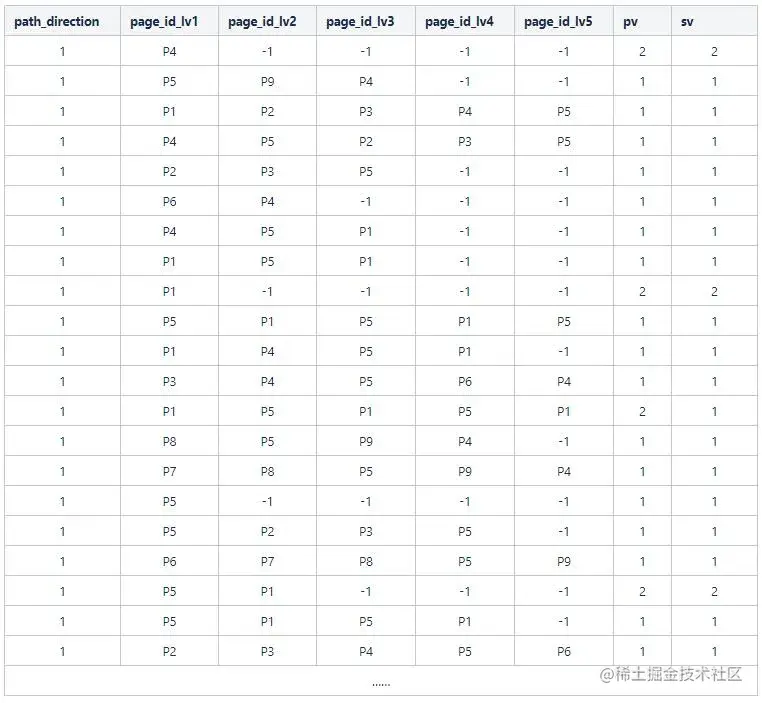 取page和page_id_previous1, page_id_previous2, page_id_previous3 ,page_id_previous4得到负向五级路径(path_direction为2),取page和page_id_next1, page_id_next2, page_id_next3, page_id_next4得到正向五级路径(path_direction为1),分别计算路径的pv和sv(按照sid去重),得到如下数据dfSessions,