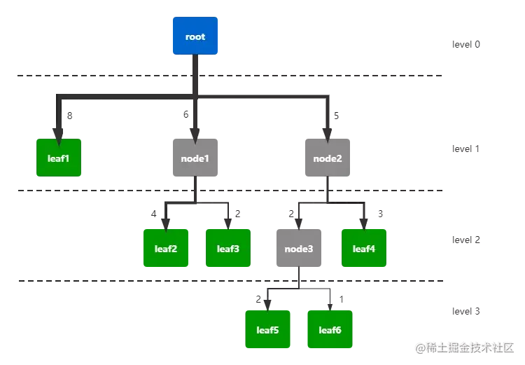 根据4.3.3,在取数阶段我们会分层取出所有原始数据,而原始数据中包含了完整和非完整路径。如下图是直接根据原始数据构造的树(原始树)。按照我们对完整路径的定义:路径深度达到5且结束节点为退出或其它节点;路径深度未达到5且结束节点为退出。可见,图中标红的部分(node4_lv1 → node3_lv2)是一条不完整路径。