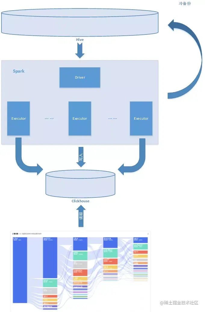 数据来源于统一的数据仓库,通过Spark计算后写入Clickhouse,并用Hive进行冷备份。数据流向图见图3.1-1。