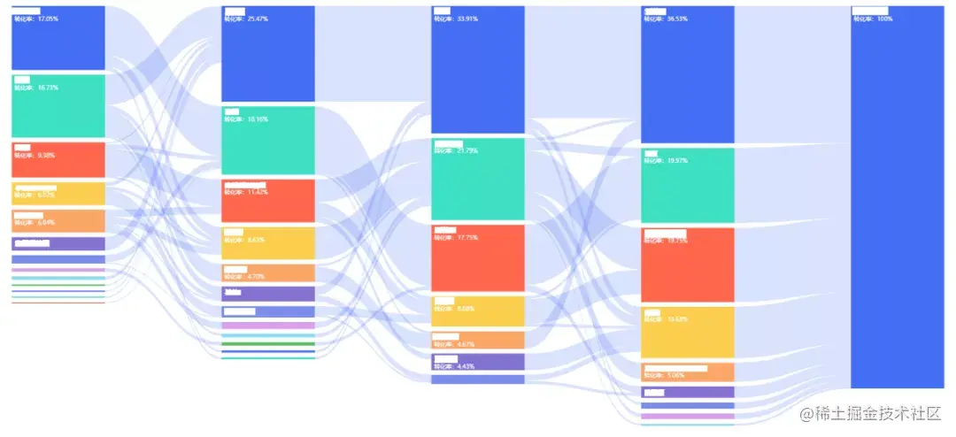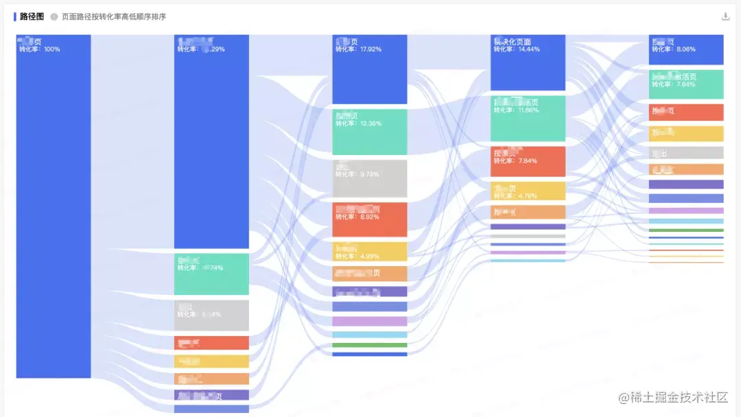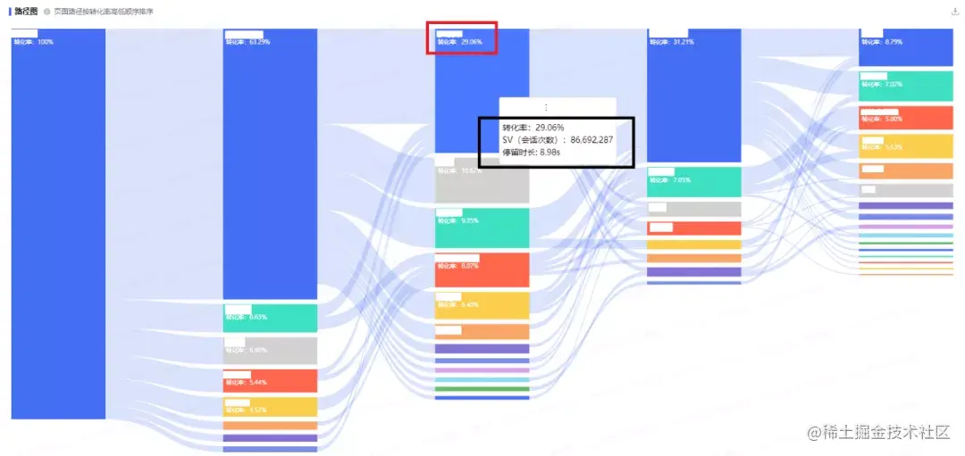 桑基图(Sankey diagram),即桑基能量分流图,也叫桑基能量平衡图。它是一种特定类型的流程图,图中延伸的分支的宽度对应数据流量的大小。如图4.1-1所示,每条边表示上一节点到该节点的流量。一个完整的桑基图包括以下几个内容:节点数据及节点转化率(下图红框部分)、边数据及边转化率(下图黑框部分)。转化率的计算详见【3.5. 转化率计算】。