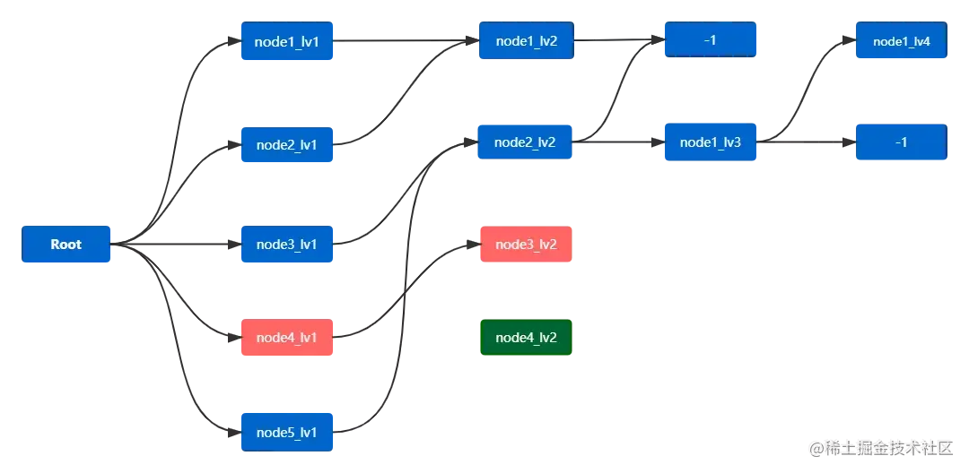 另外,原始树中还会出现孤立节点(绿色节点node4_lv2)。这是由于在取数阶段,我们会对数据进行分层排序再取出,这样一来无法保证每层数据的关联性。因此,node4_lv2节点在lv2层排序靠前,而其前驱、后继节点排序靠后无法选中,从而导致孤立节点产生。