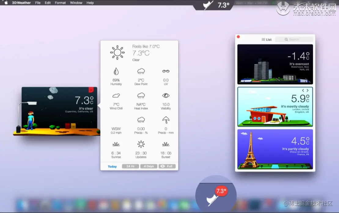 Weather3D是一款适用于您的macOS的令人印象深刻的天气应用程序,与其他可用的天气应用程序不同,Weather3D以惊人的3D样式为您提供天气信息,因此最重要的是,所有重要的天气更新都可以通过小部件传递给您在桌面上显示某个地方天气的魅力。它使您可以在桌面上保留3D动画小部件,该小部件可显示您所设置位置的当前天气状况的风景图像。