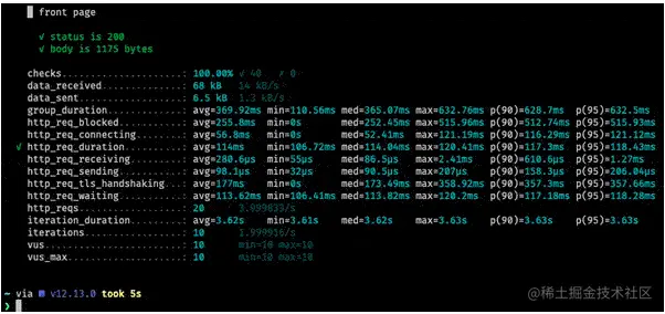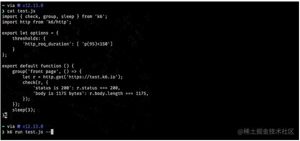k6有一个检查和阈值的概念,检查有点类似于断言,但是检查不会中断脚本的执行,只是单纯地存储通过或失败的结果,脚本能持续运行;而阈值是全局通过或失败的标准,可以验证结果指标是否在指定范围内,若不在阈值范围内,脚本将以失败的结果结束运行,阈值非常适合于持续集成测试;k6还可以将脚本运行结果输出到外部存储,如输出到InfluxDB,Kafka,k6云。更多详细的信息可以参考官网了解。