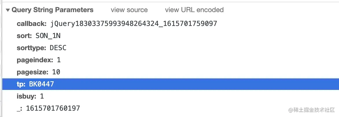 我们来查看此响应的请求。如图,我们找到了url,并且有两个请求参数。