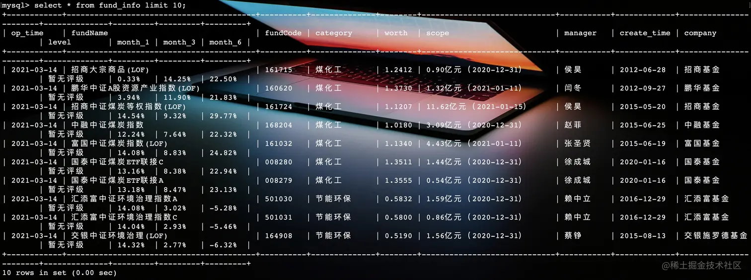 sql = f"insert into fund_info values('{today}', '{fundName}', '{fundCode}', '{category}', '{worth}', '{scope}', '{manager}', '{create_time}', '{company}', '{level}', '{month_1}', '{month_3}', '{month_6}')"