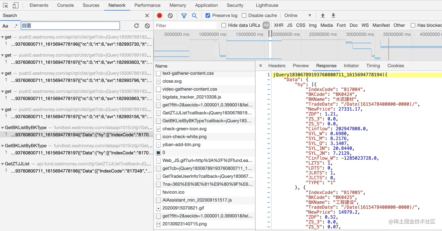 根据返回数据中的关键字搜索,如图,我们根据"白酒"找到了对应的响应内容。这里先看看返回的内容,这里记住BKCode和Bkname两个字段。