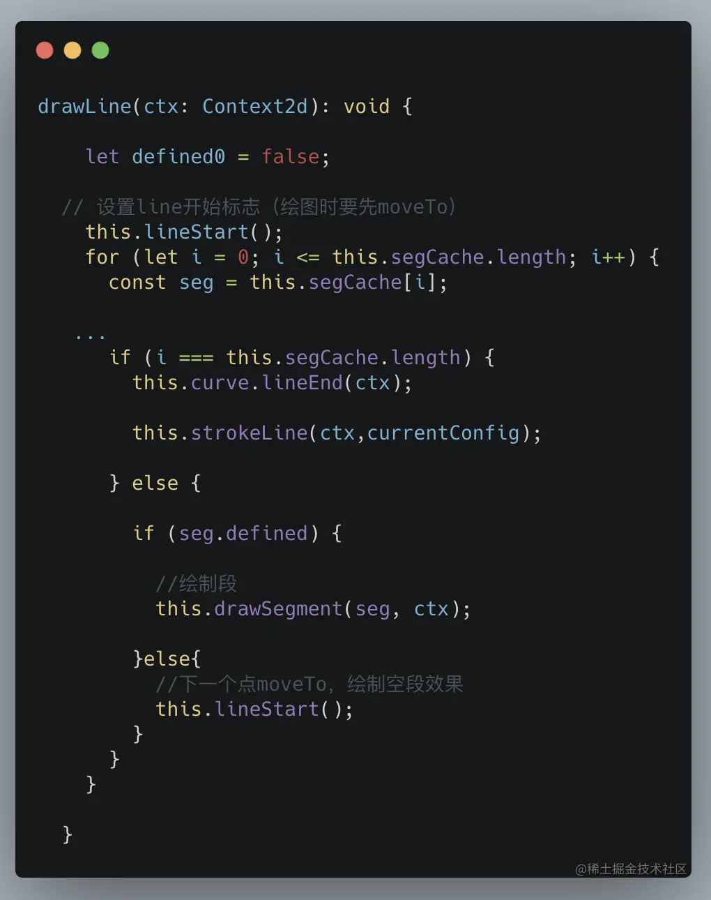 基于上面画线的方法,我们只需要遍历一条线中的所有段,依次连接就可以了。为了处理空段的绘制,设置一个lineStart的标记变量,如果处于start状态,会先moveTo到新的点,而不是lineTo。大致的绘图流程如下: