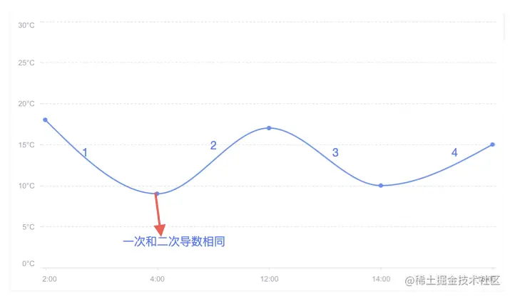 我们了解了如何绘制三次贝塞尔曲线,但是回到我们的线图,一个线图会有不确定数量的点被平滑的连接起来,但是目前三次贝塞尔曲线显然无法满足这个需求。我们前面谈到了分段的概念,一条完整的曲线被分成了多段,如果每一段都是一条三次贝塞尔曲线,问题就解决了。那么问题就转化成了如何构造多条能依次平滑拼接的贝塞尔曲线。在图形学中有个概念叫“样条曲线”,专业的概念有点难懂,我们这里简单理解就是将一个点的集合,分成多段曲线,各曲线处的连接点处有可以平滑连接(有连续的一次和二次导数)。关于样条曲线的连续性以及贝塞尔曲线的更多特性,读者可以参考《计算机图形学(第四版)》一书第14章——《样条表示》,这里我们就不深入解释了,直接看例子。