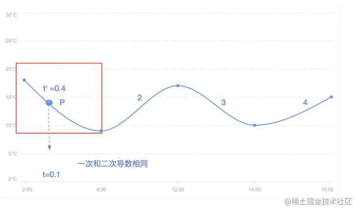 曲线的每个段的起止点会因为插值算法的不同而不同,后面我们会详细介绍。