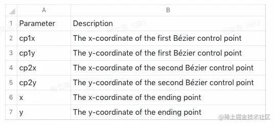 三次贝塞尔曲线使用 bezierCurveTo() 方法来绘制,参数定义如下: