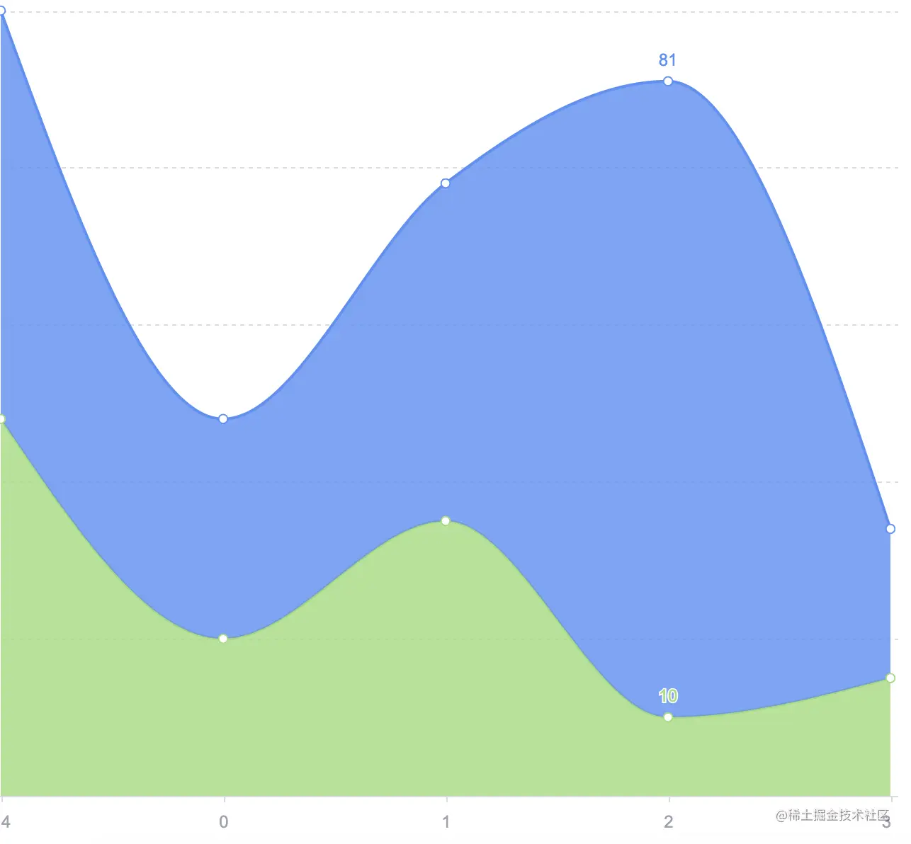 上面我们看到的动画不同的线之间虽然可以再同一时间到大终点,但是过程中在x方向的位移是不同步的。同步和不同步都各有需求,尤其是在面积图情况下,单个面积图实际被拆分了上下两组segment。如图41.