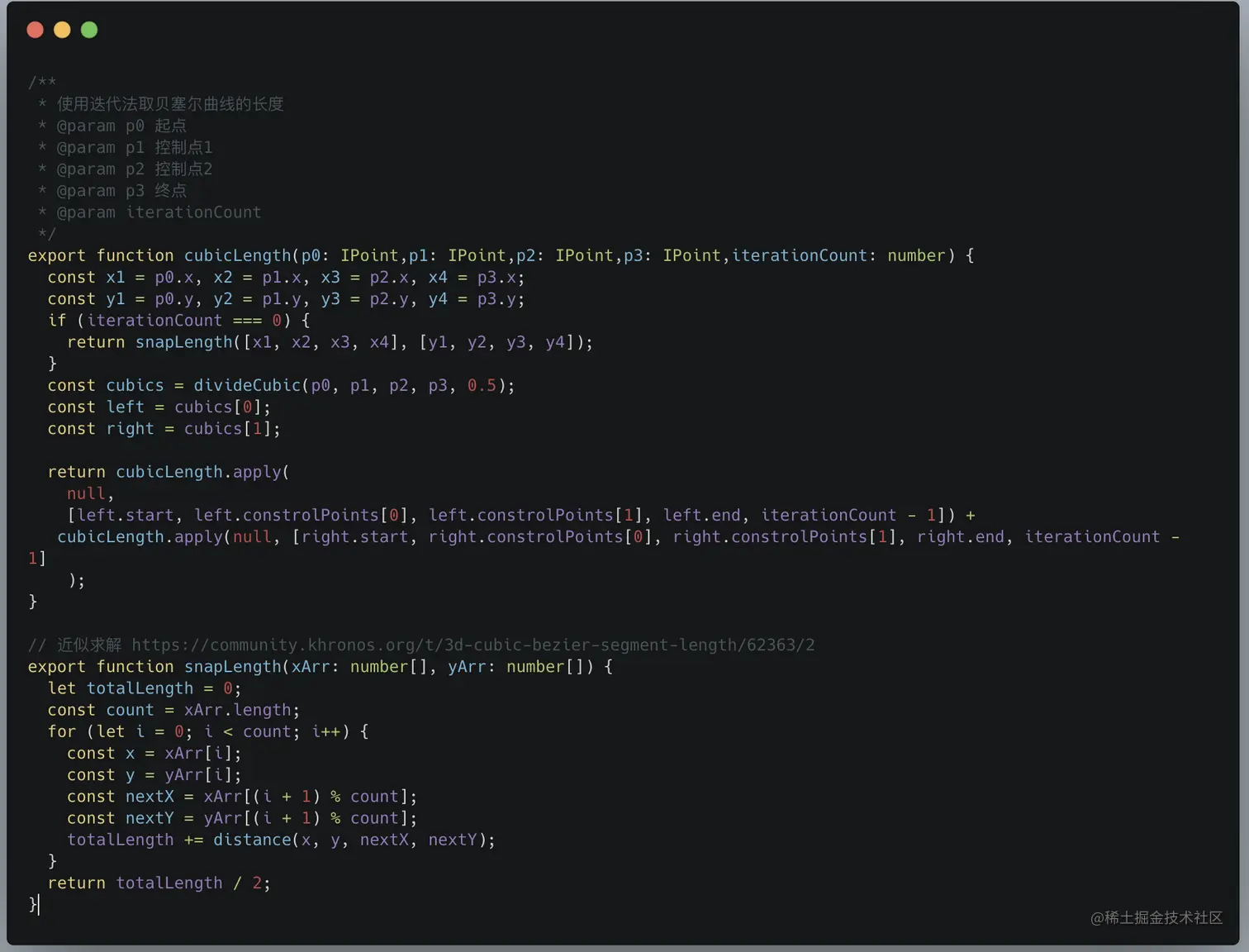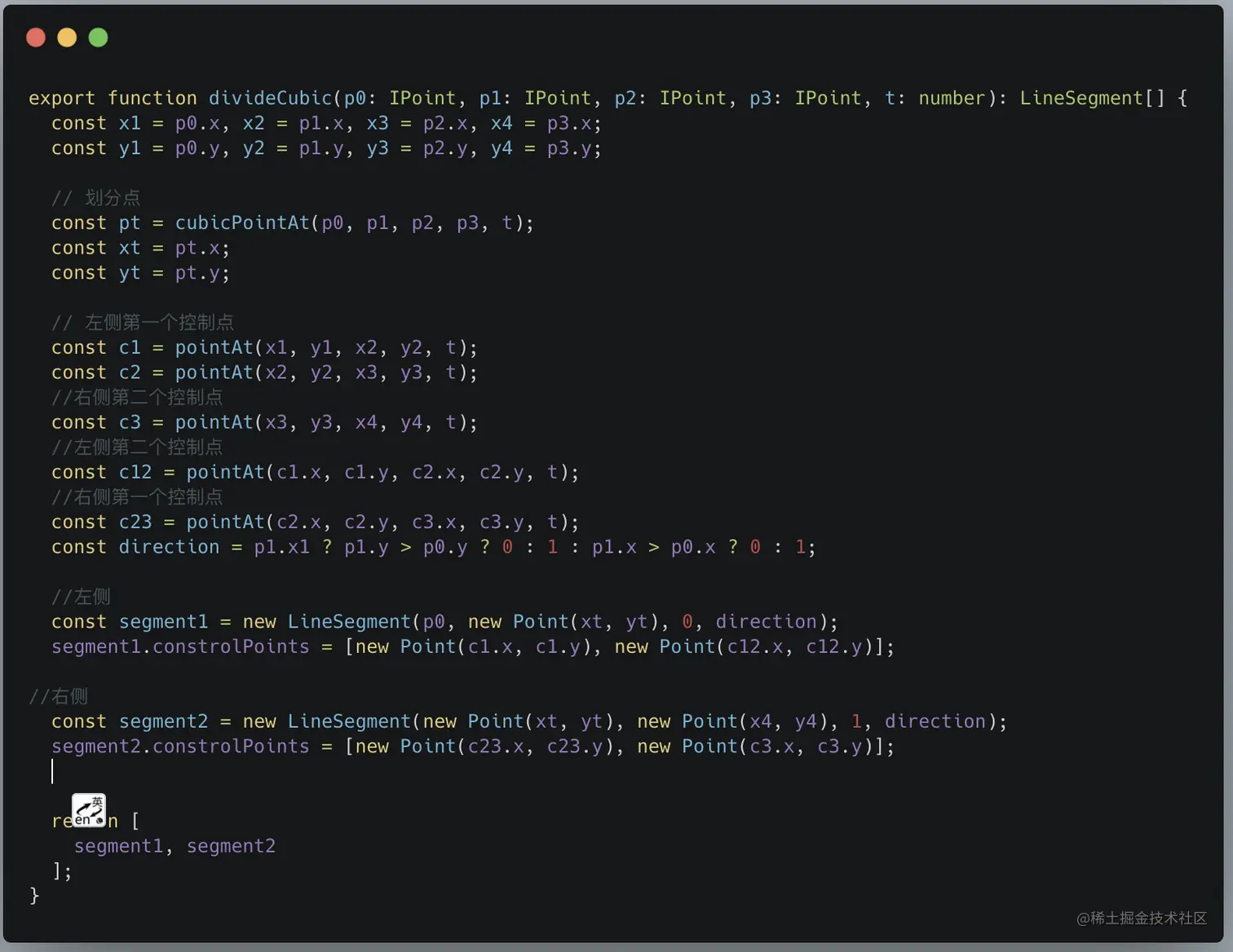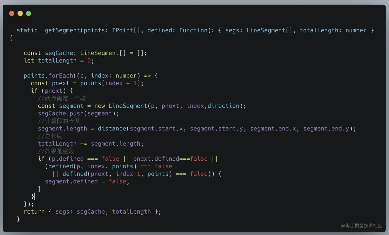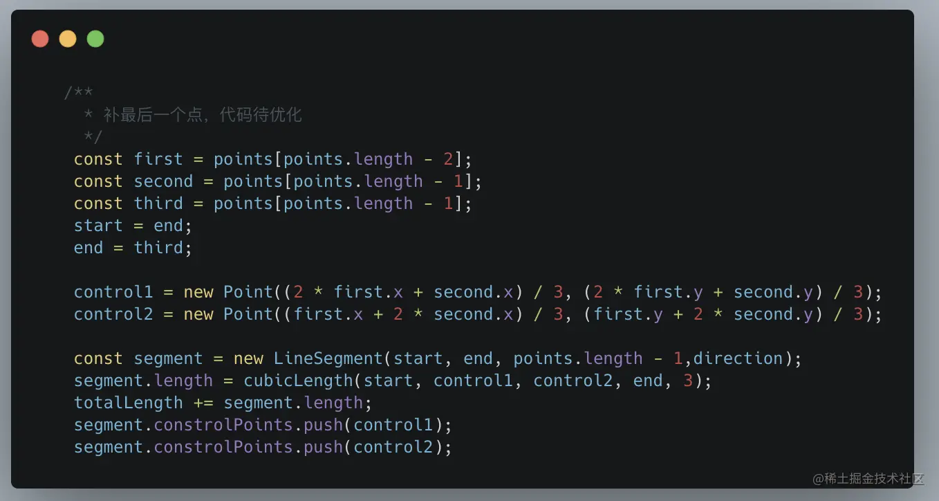 - 我们的主流程逻辑很简单,循环给到的点,从当前索引位置开始向后取出3个点,然后根据这三个点以及当前段的起始点计算结束点和控制点。每个新段的起点是上一个相邻段的终点。随后计算当前段的长度。 当前的循环逻辑不会计算到最后一个点,所以会少一个段,最后加个单独的逻辑来处理。