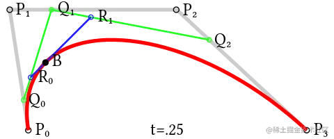 如图21,假设我要在t=0.25的位置将当前曲线切分成两条曲线,首先我们要知道点B的位置。根据公式带入即可: