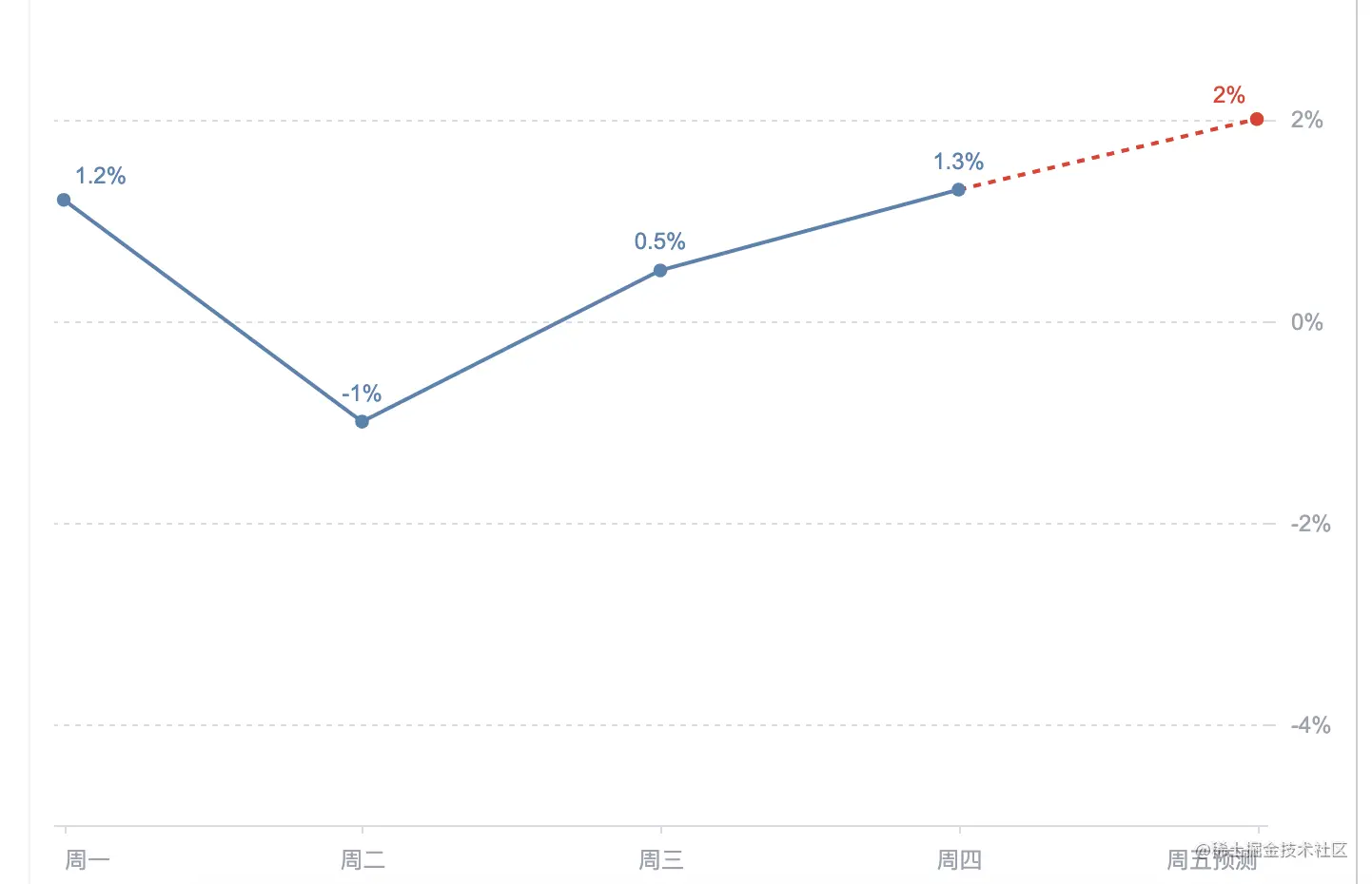 这里你可能要疑惑,这里将线拆成段并没有什么优势,为什么不直接连接各个点呢?分成段完成了一个线的绘制的骨架,在这个骨架基础上,很多功能都会很容易的扩展。比如,线的每一段都有不同的含义,可视化层面要展现这些不同的含义需要给线赋予不同的样式。这里我们可以给LineSegment配置一个LineSegConfig,独立配置每个段的样式,在绘制的过程中如果发现新的段的样式发生了变化,就可以立即进行渲染,然后开始绘制新段,灵活拼装。比如下图,末尾的红色虚线用来表示预测数据。