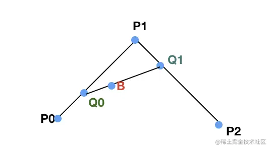 - 第一段曲线的第二个控制点的运动轨迹是线段Q0Q1,和t线性相关