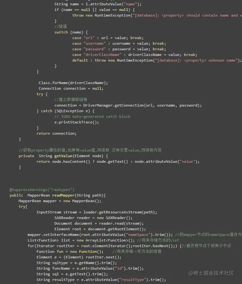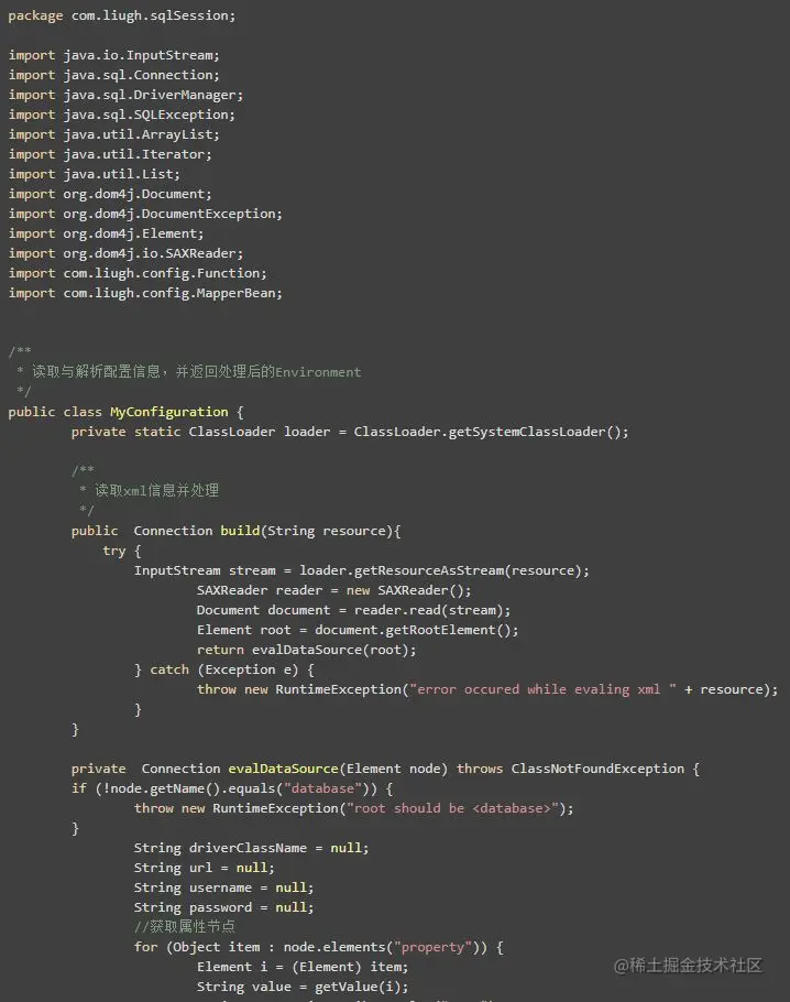 从图中可以看出,MyConfiguration 负责与人交互。待读取 xml 后,将属性和连接数据库的操作封装在 MyConfiguration 对象中供后面的组件调用。本文将使用 dom4j 来读取 xml 文件,它具有性能优异和非常方便使用的特点。