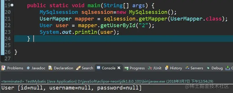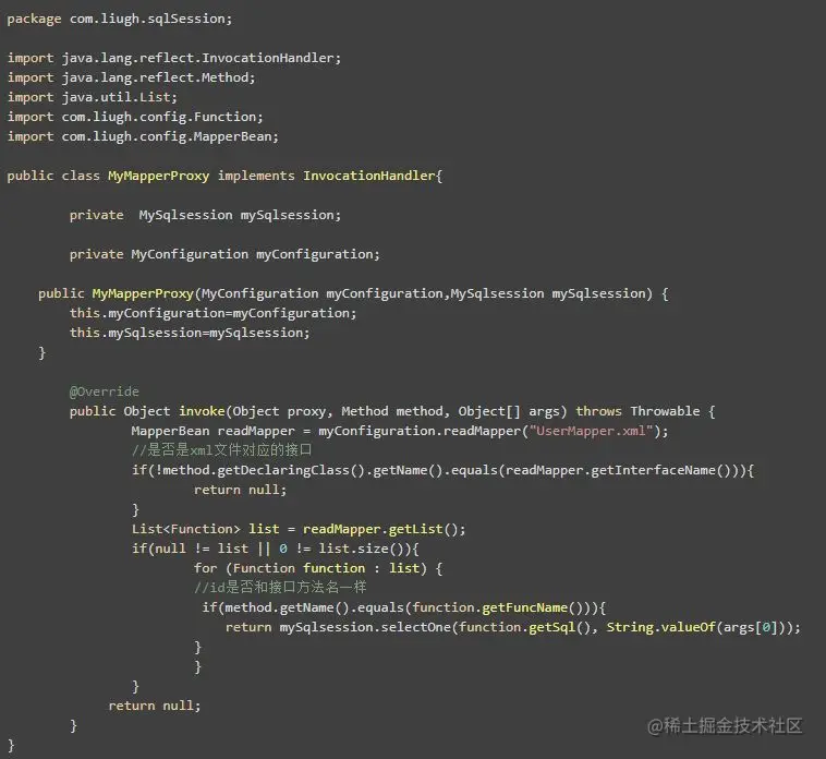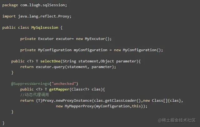 接下来实现我们的 MySqlSession, 首先的成员变量里得有 Excutor 和 MyConfiguration,代码的精髓就在 getMapper 的方法里。