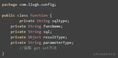 Function 对象包括 sql 的类型、方法名、sql 语句、返回类型和参数类型。
