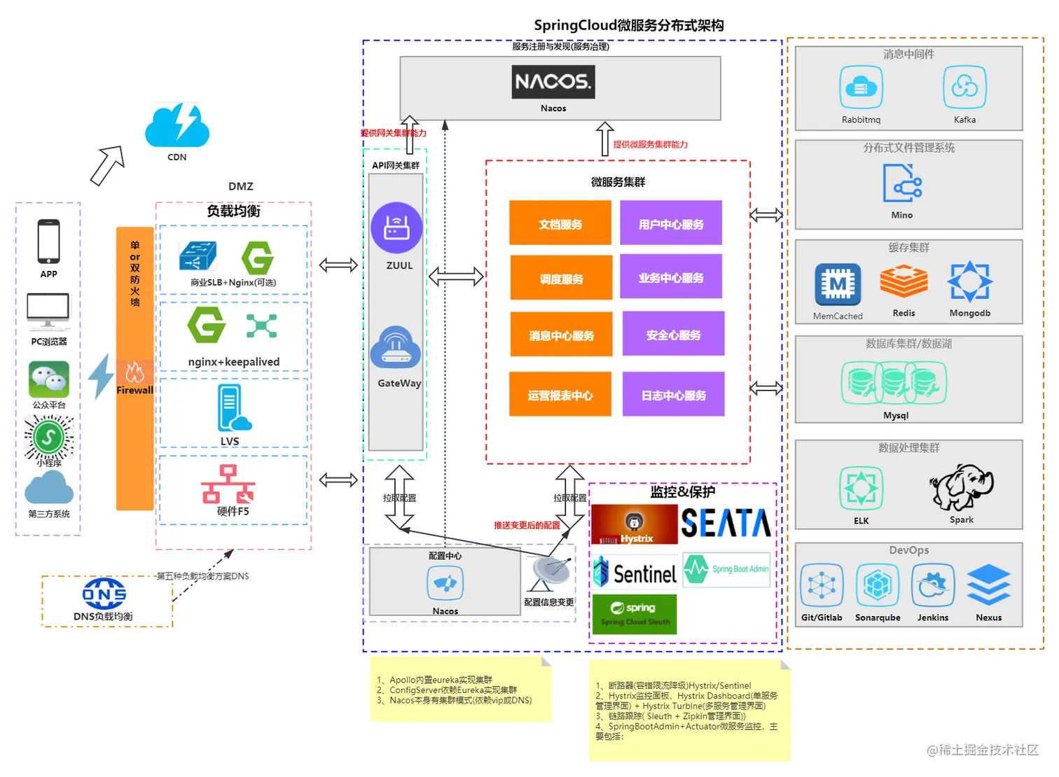 2、再向后面发展单体应用的复杂、不复用等弊端就越来越明显,后面就出来了微服务架构,当然,微服务是一种技术架构,但最终技术架构也是服务于业务。对业务的拆分与实现业务系统间的通信。可以看到下图微服务的生态比较全面,也比较