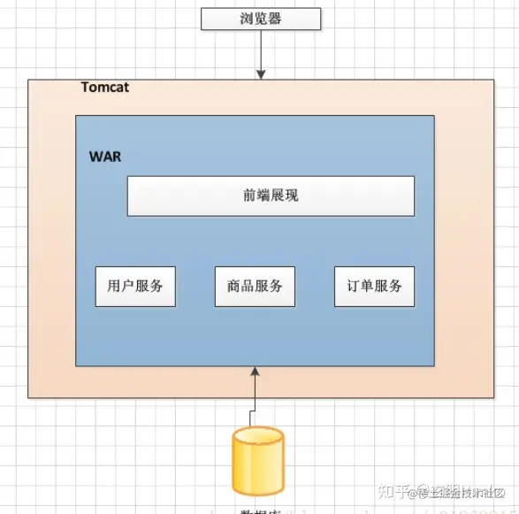 1、传统的单体应用前后台都混在一起组成一个庞然大物,各自独立也就是人月中的烟囱式模式应用。可以看到下图各种业务都混在一起。