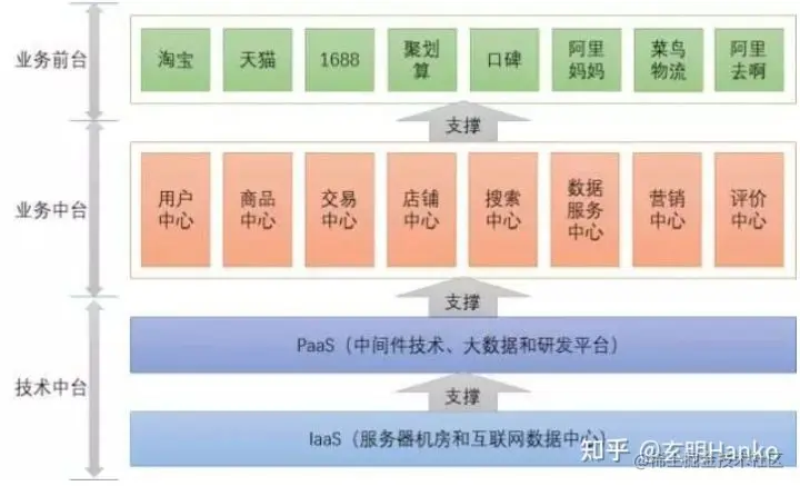 3、后面就是阿里提出的“大中台、小前台”的战略。对业务系统进行组织的划分,分出了业务中台、数据中台、技术中台。在原本淘宝、天猫基础上增加了共享业务事业部进行复用的改造。