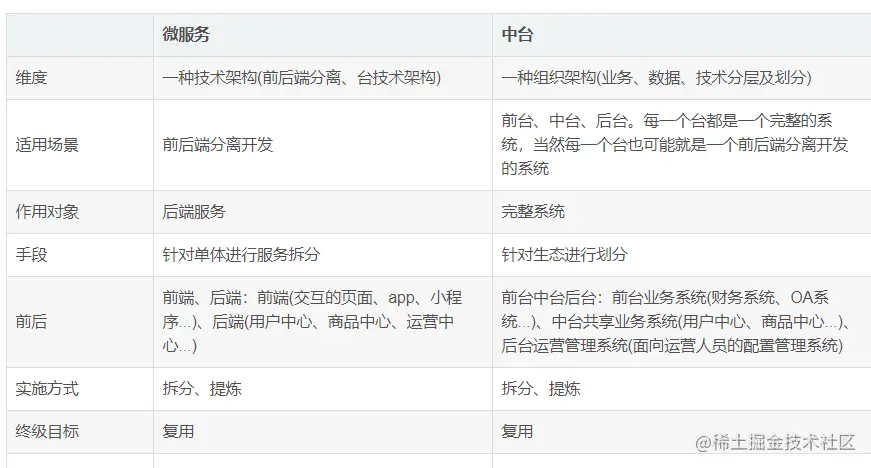 微服务是一种技术架构,中台是一种企业治理思想和方法论****。中台可以依赖于微服务架构来实现相应的功能。其实我们还是比较脸盲这两者,必尽两者的核心都是在“拆”。