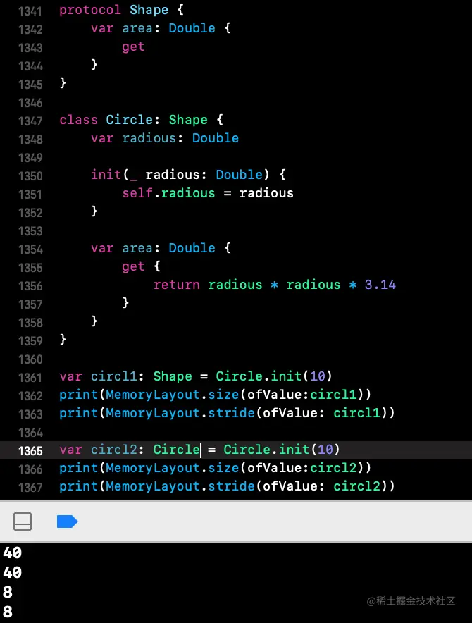 查看上图代码这个也和协议类似,虽然在创建实例变量的时候是Shape类型,但是他会去pwt中调用原类型的vtable,再通过vtable来调用原类对应的方法