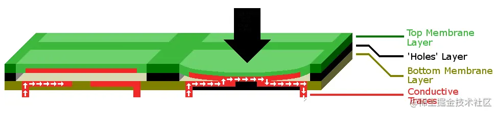 顶层薄膜由一个框架支撑,其底部涂有一些导电的材料。底层中有一些断开的导电材料。当顶层薄膜被按下导致两层接触时,电路被接通,为了追求轻薄,大部分笔记本键盘都是采用这种类似的结构,在此基础上进行优化,比如 Mac 的剪刀式结构。这种键盘的一个缺点是使用寿命短,通常只有几百万次。