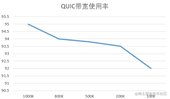 我们还做了在带宽受限的情况下,QUIC 对于带宽的使用率,基本上 QUIC 对于带宽的使用率都能达到90%以上,然而 TCP 就要差很多。