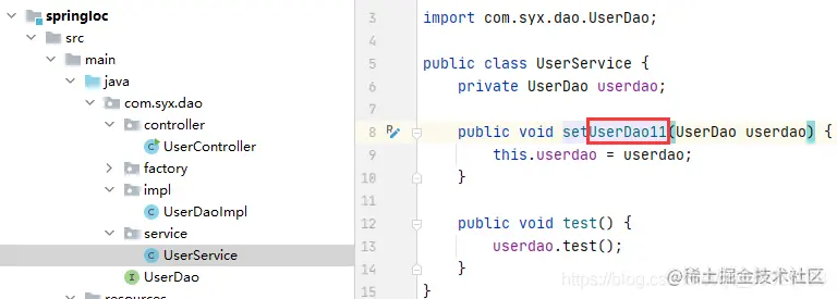 如下图中UseService文件依赖Userdao对象,可以通过setUserDao11函数设置注入