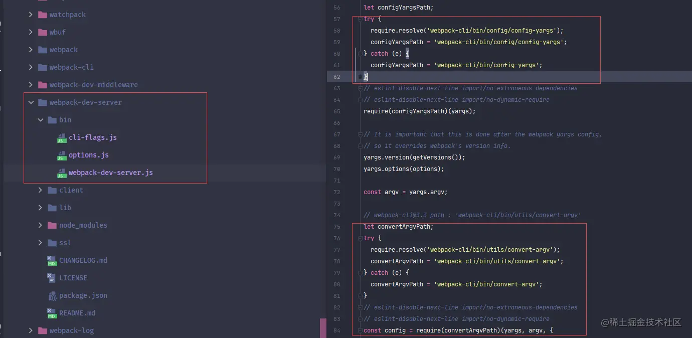 在 /bin/webpack-dev-server.js 文件模块中加载了webpack-cli库中的 /bin/ [config/] config-yargs 和 /bin/ [utils/] convert-argv 。