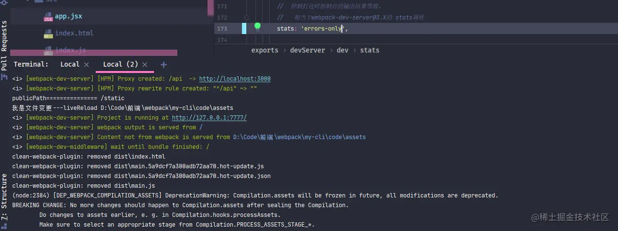 如果将dev.stats设置为errors-only,控制台就不会有这么多日志,errors-only属性值代表只有在代码打包错误时才输出日志。