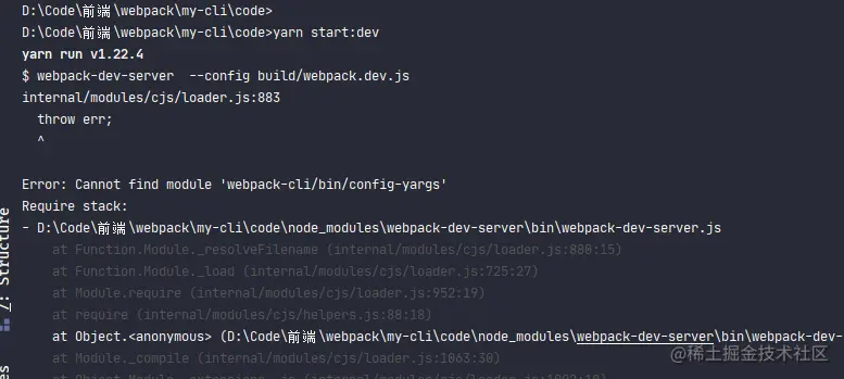 错误提示是找不到webpack-cli库中的config.yargs模块。感觉会有不少刚学习webpack并且搜索能力稍微弱一些的朋友会卡在这。