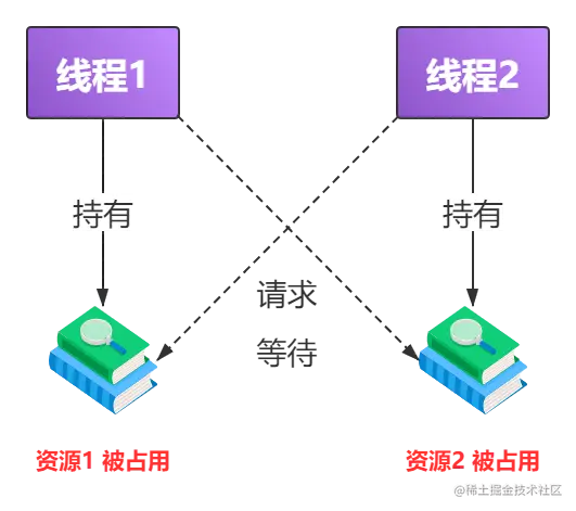 - 如:线程 1 持有资源 1 ,线程 2 持有资源 2,但是两个线程都想要请求对方的资源,但是双方又互不释放已有的资源,若无外力介入的情况下,就会陷入互相等待的死锁状态。