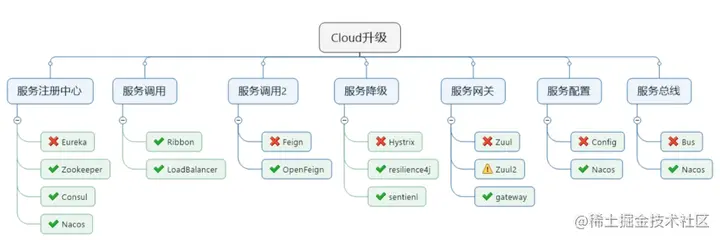详情见下图(×的表示之前的组件,现在停更了的;√ 的表示新的替换后的组件): 先引用一张图,来源www.cnblogs.com/y3blogs/p/1… 目前版本在企业基本可以满足使用,后续springcloud也相继推出自己的替代品或推出新的第三方替代品。考虑到技术要同步迭代及更新部分组件在spring官网替代品出来之前也可以提前有个替代方案。